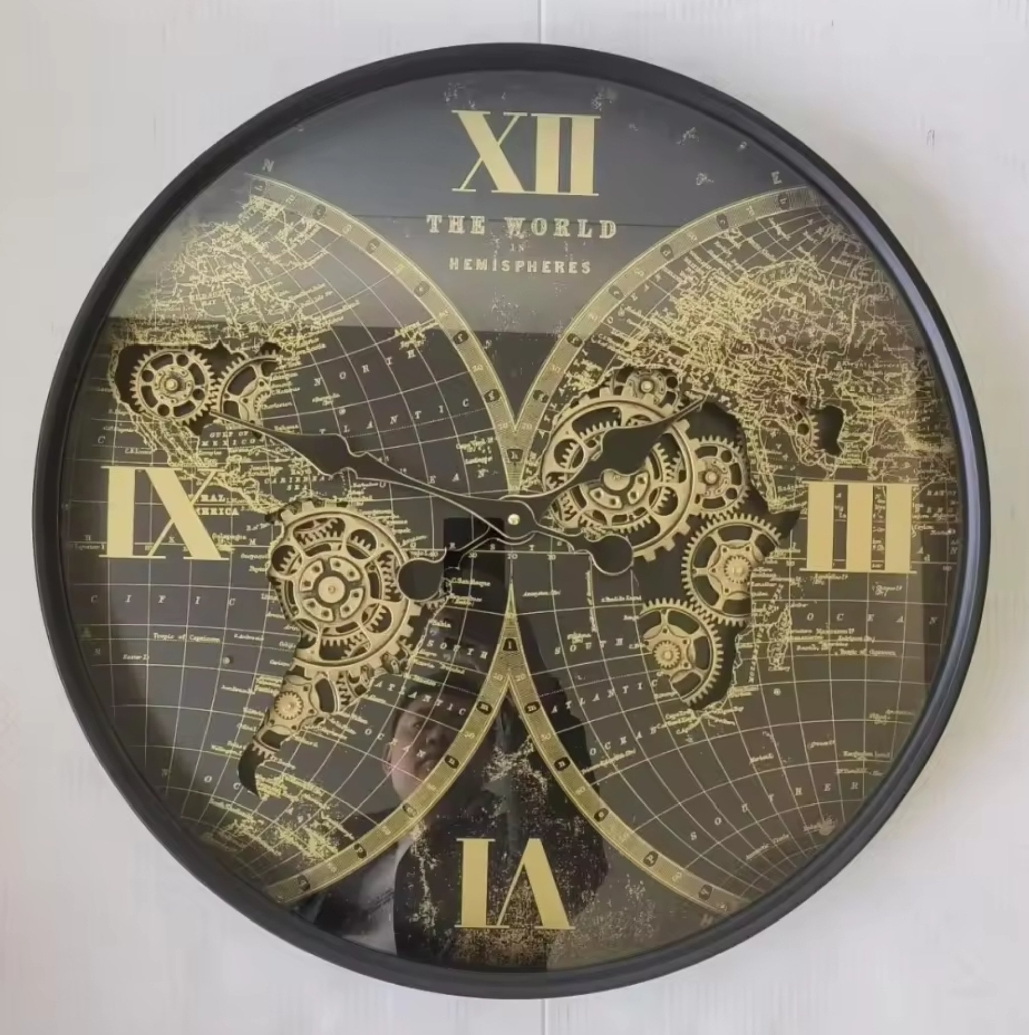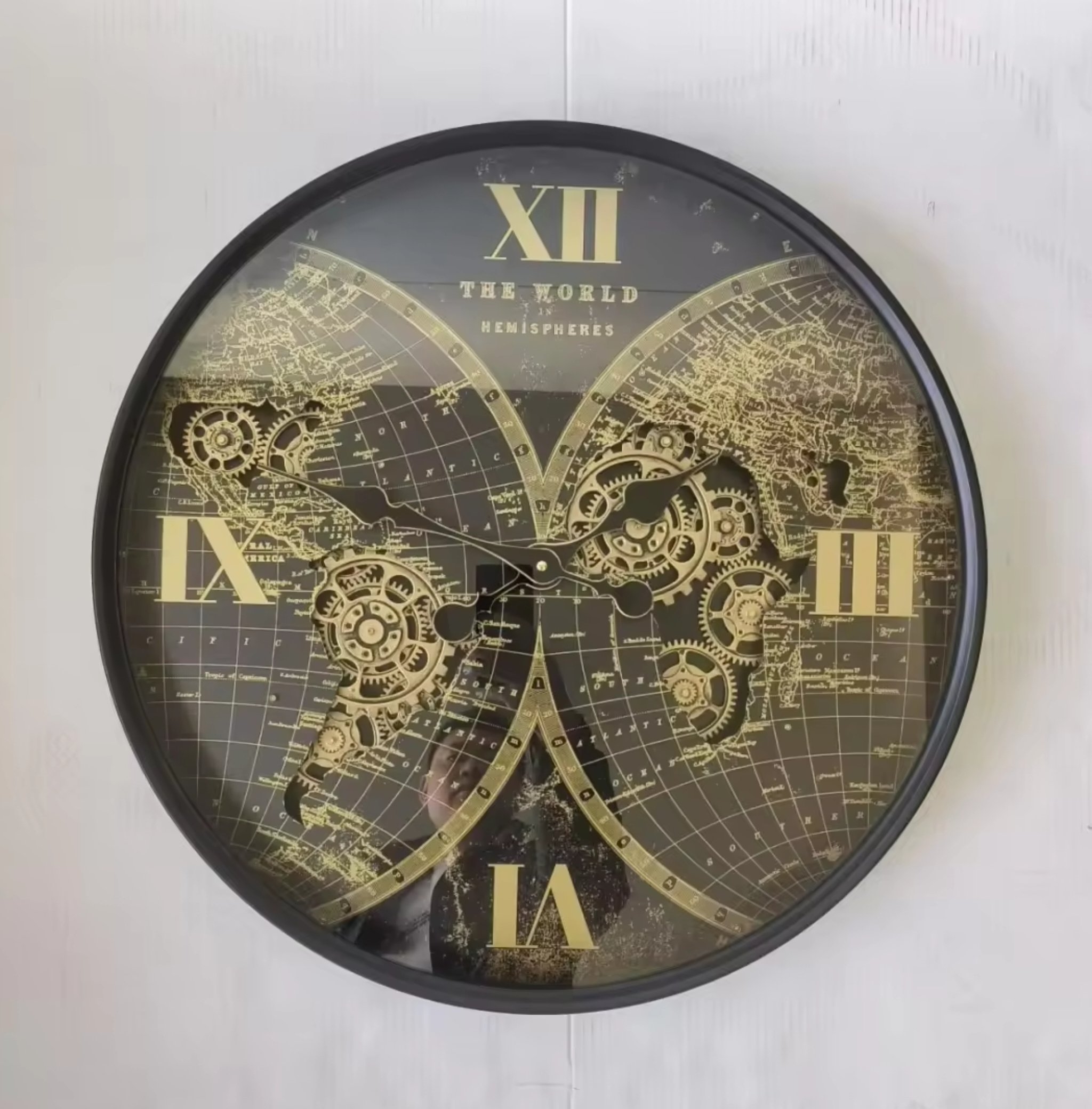 Mechanical moving gears Vintage world hemisphere decorative wall clock with moving gears