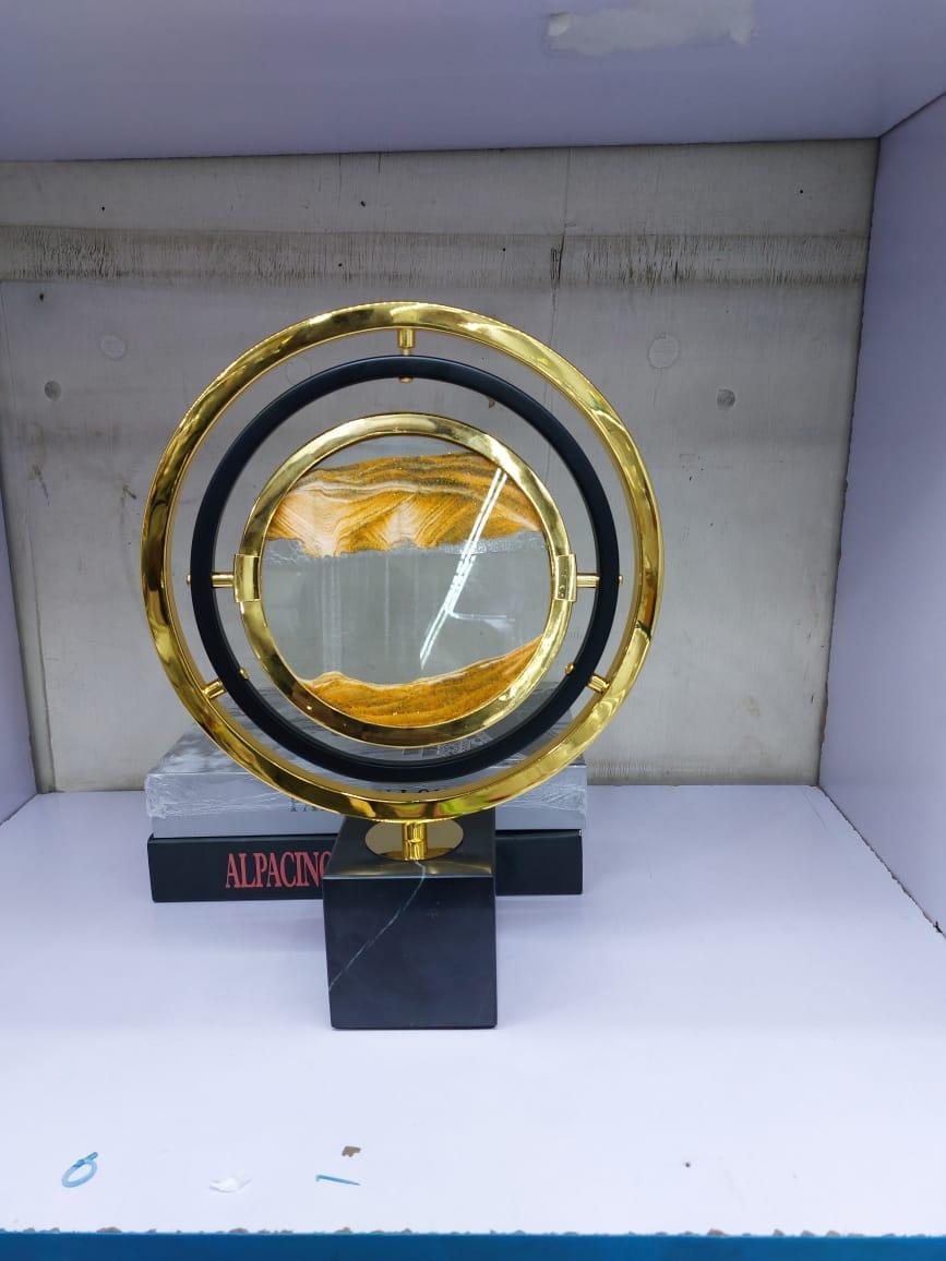 This captivating sand art sculpture allows sand to gently move through a glass display, surrounded by gold & black metal rings & sitting atop a black marble plinth.
